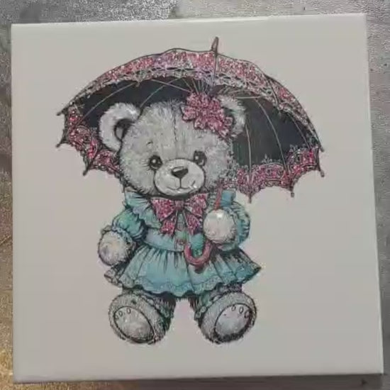 Cute Teddy Bear Engraved Tile with Sparkly Flakes – Dark Whimsy Home & Gift Décor